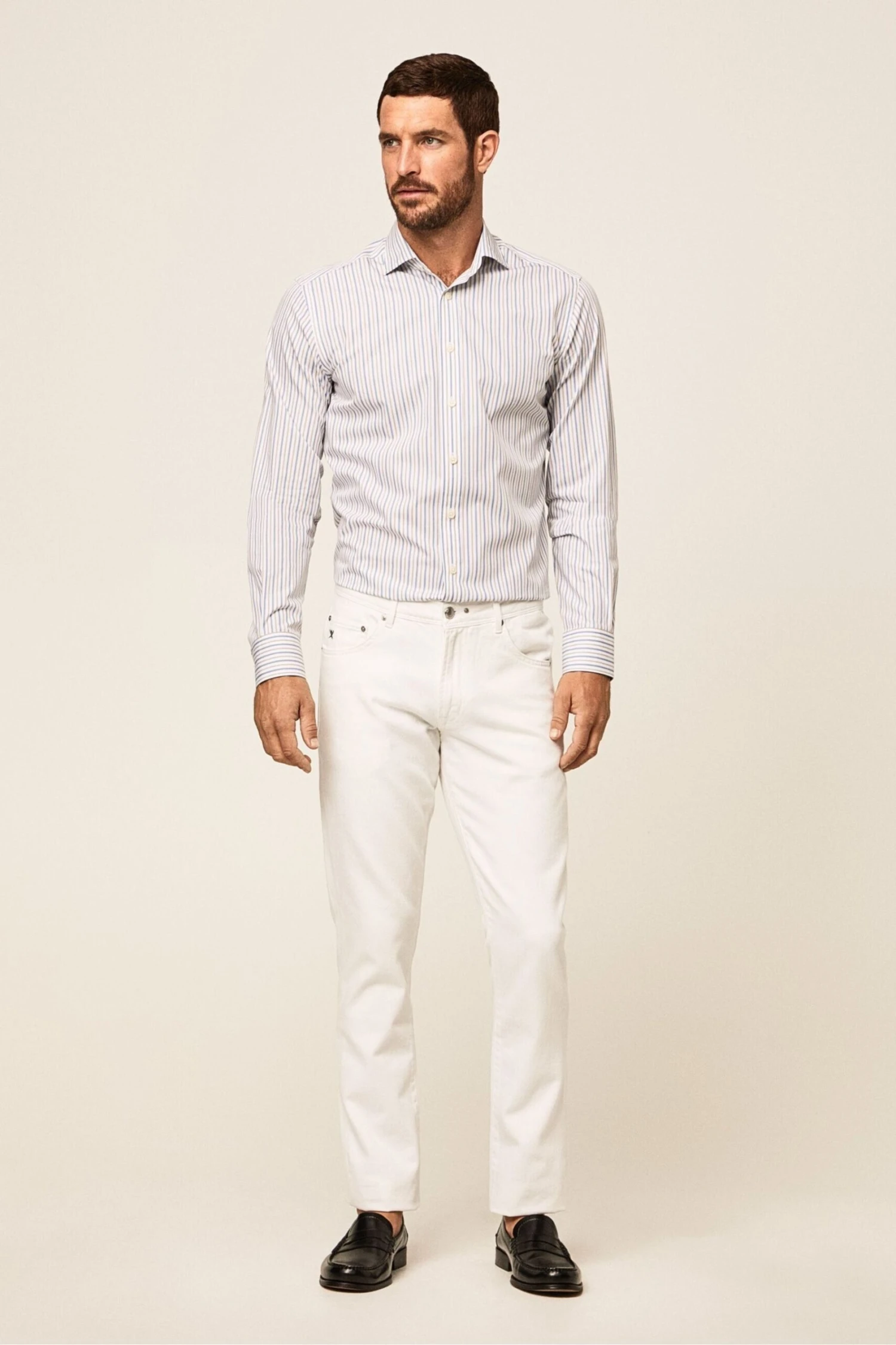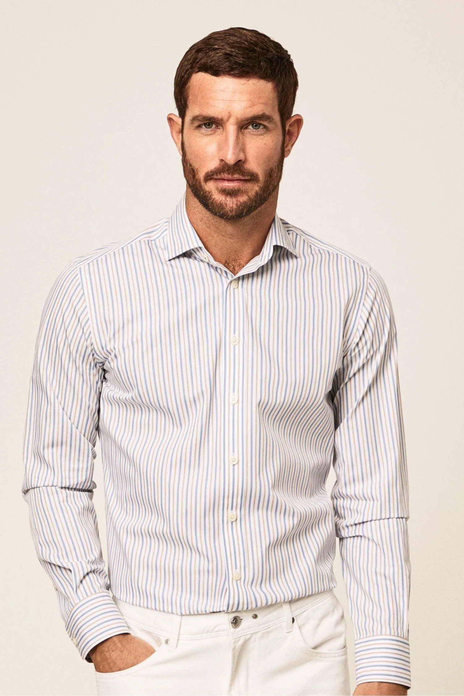A smart two-colour striped shirt with melange yarns on a soft, slubby cotton base. Our bestselling kent collar.
