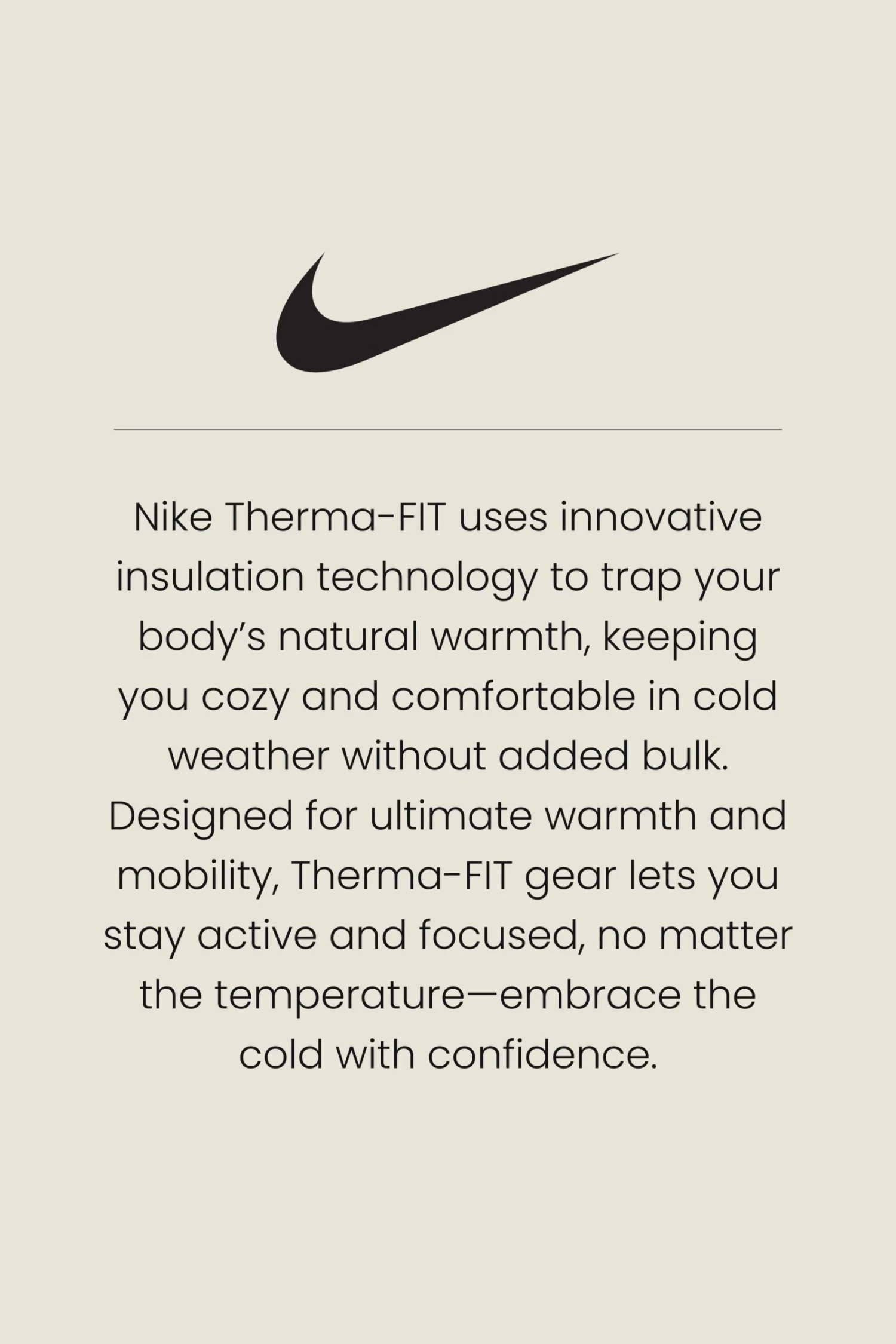 - Nike Therma-FIT technology helps manage your body’s natural heat to help keep you warm in cold-weather conditions.