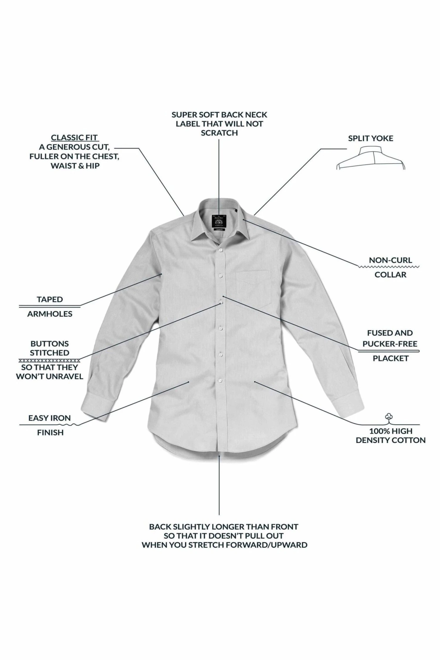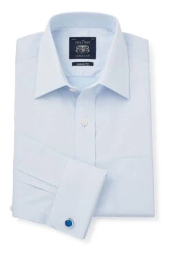 A versatile addition to any formal collection. A 100% cotton sky blue shirt crafted using a twill weave. Complete with a curl resistant collar and elegant double cuffs. All of our shirts now come in fully recyclable packaging.